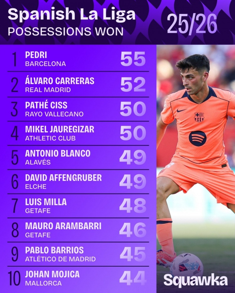 Một vài ngày trước, Squawka đã đếm số lần anh ấy lấy lại bóng ở La Liga mùa này, với Pedri xếp hạng 55 lần đầu tiên và Carreras thứ hai 52 lần.