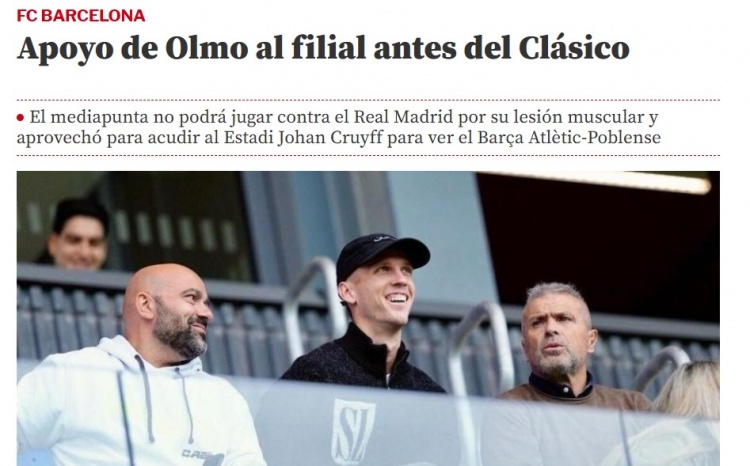 Tiền vệ Olmo của Barcelona đã bỏ lỡ trận El Clasico cuối tuần này do chấn thương. "World Sports News" đưa tin Olmo đã đến xem trận đấu của đội Barcelona B vào Chủ nhật tuần này.